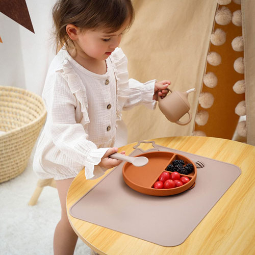 1、隨意折疊更便捷,矽膠(jiāo)材質不褶皺、防滑設計、穩固防滑餐墊安穩的貼在桌麵上。