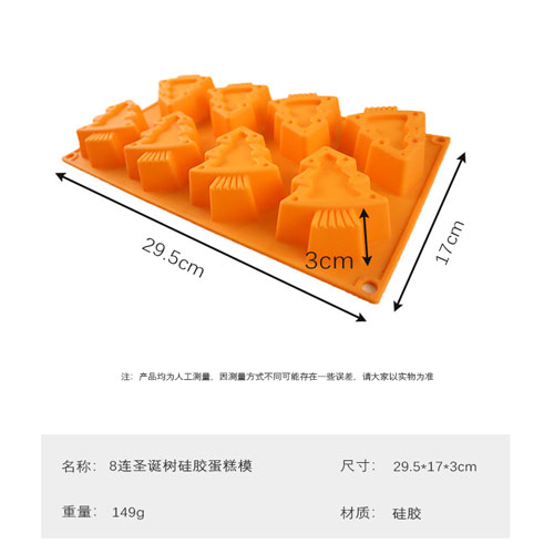 8連聖誕樹蛋糕模采用(yòng)食品級矽膠製成,無毒無味,耐高溫,符合美國FDA標準,環保無公害,使用壽命長,質地柔(róu)軟,抗撕裂,手感好,不怕摔不怕壓,攜帶方便(biàn),適用於(yú)微波(bō)爐、烤箱、冰箱、冰(bīng)櫃、洗碗機