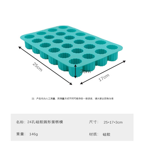 24孔矽膠圓(yuán)形蛋糕模采用食品(pǐn)級矽膠製成,無毒無(wú)味,耐高溫,符合美國FDA標準,環保無公害,使用壽(shòu)命長,質地(dì)柔軟,抗撕裂(liè),手感好,不怕(pà)摔(shuāi)不怕壓,攜帶方便,適用於(yú)微(wēi)波(bō)爐、烤箱、冰箱、冰櫃、洗碗機
